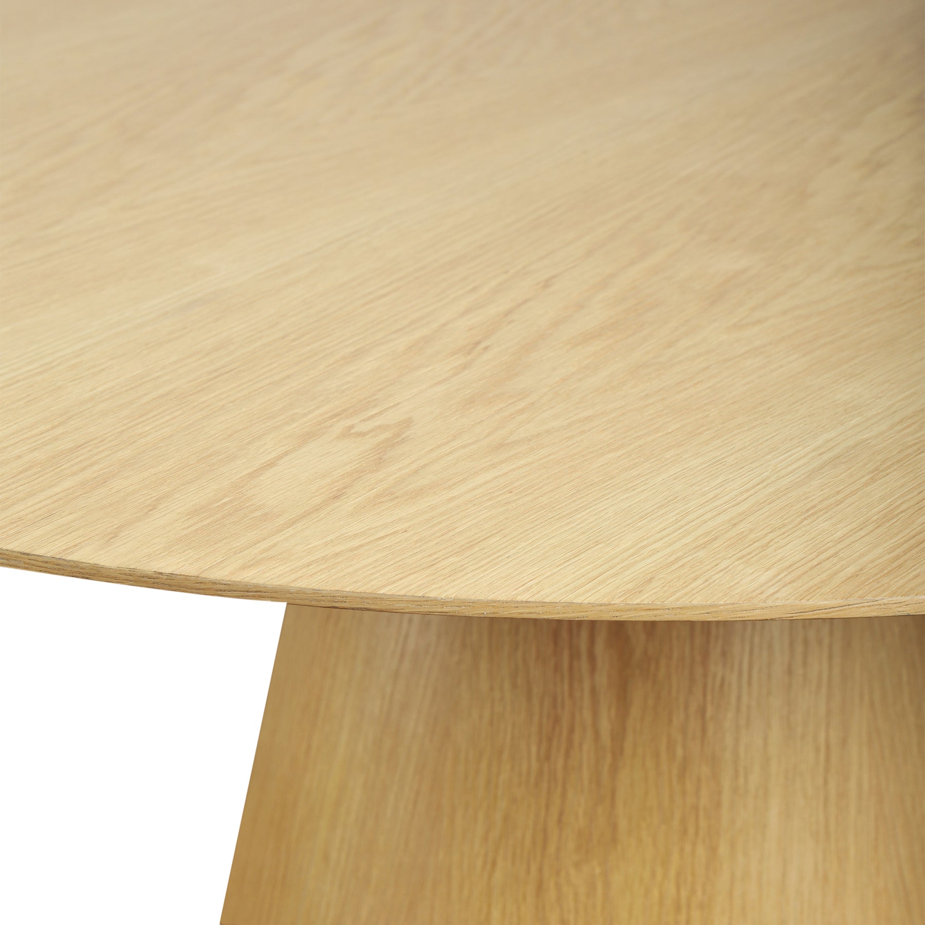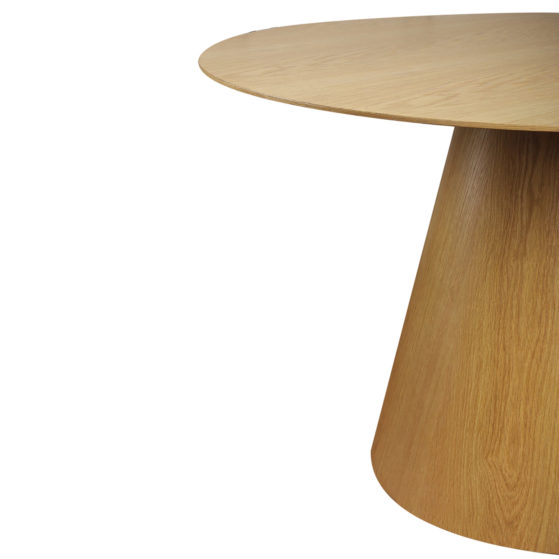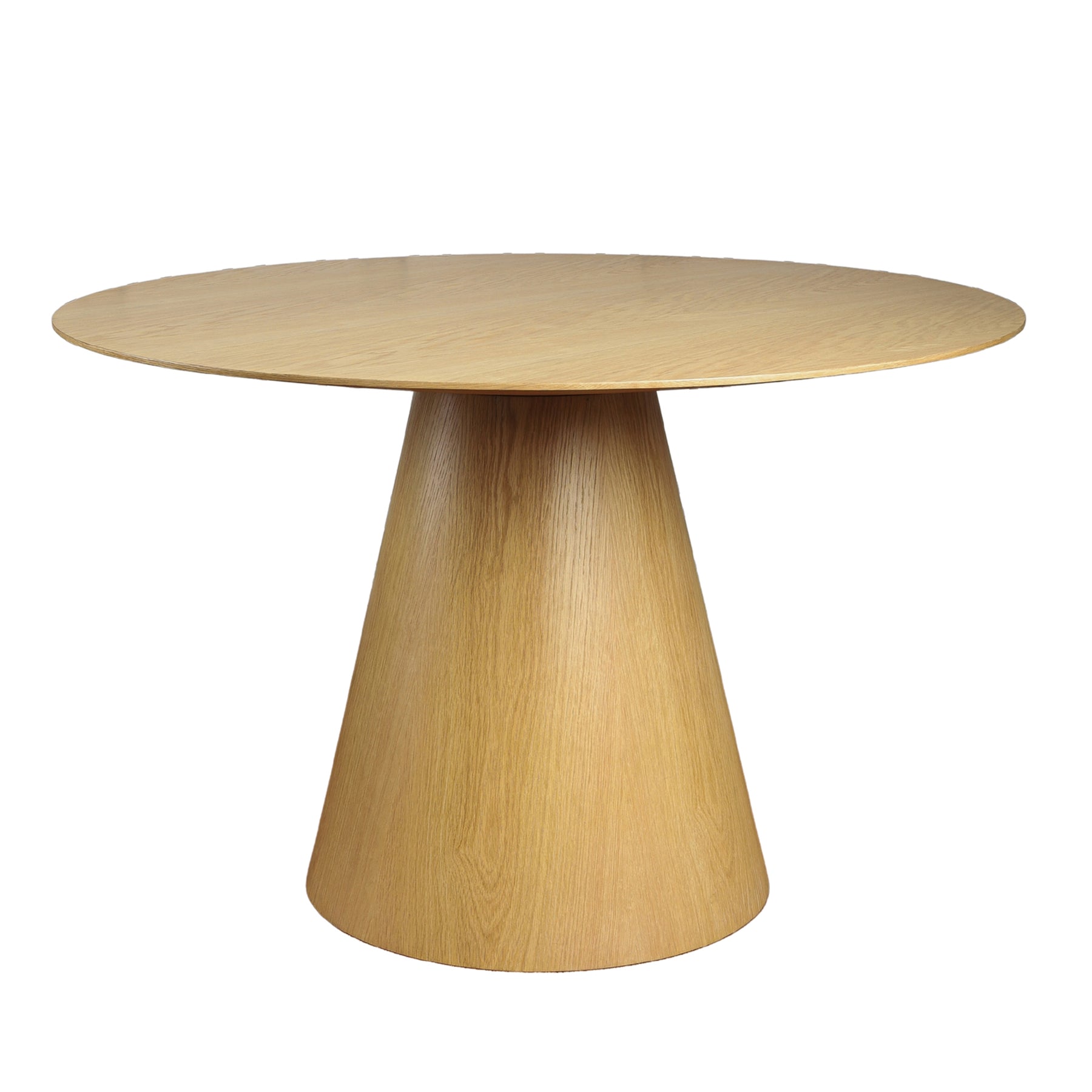 La Mesa Bell parte de una premisa concreta: una sola forma, sin interrupciones. Su base cónica reemplaza las patas tradicionales, concentrando el diseño en una pieza continua y equilibrada. El roble americano, con su veta característica y su calidez natural, completa una mesa que se adapta con naturalidad a cualquier espacio.