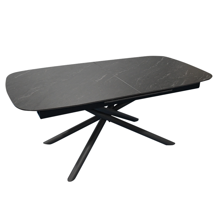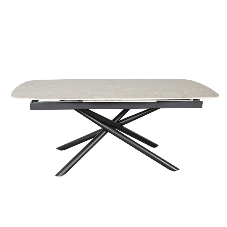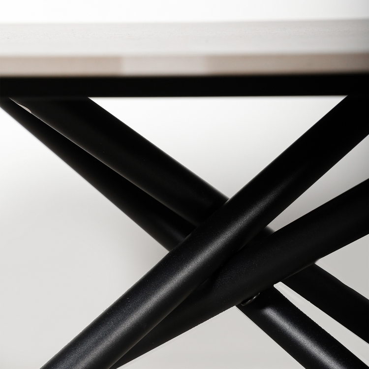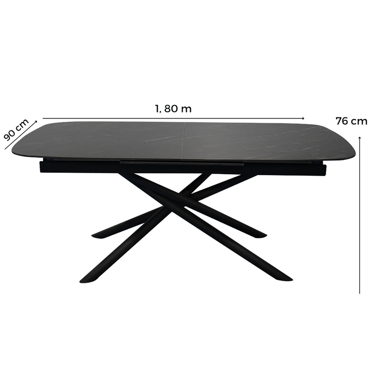 La mesa extensible Cross combina modernidad y elegancia para resaltar en cualquier espacio. Su base sólida de hierro con un diseño cruzado atractivo proporciona estabilidad y un estilo vanguardista. La tapa de mármol sintético de 12 mm de espesor agrega un toque sofisticado, resistente al desgaste diario y fácil de limpiar.
