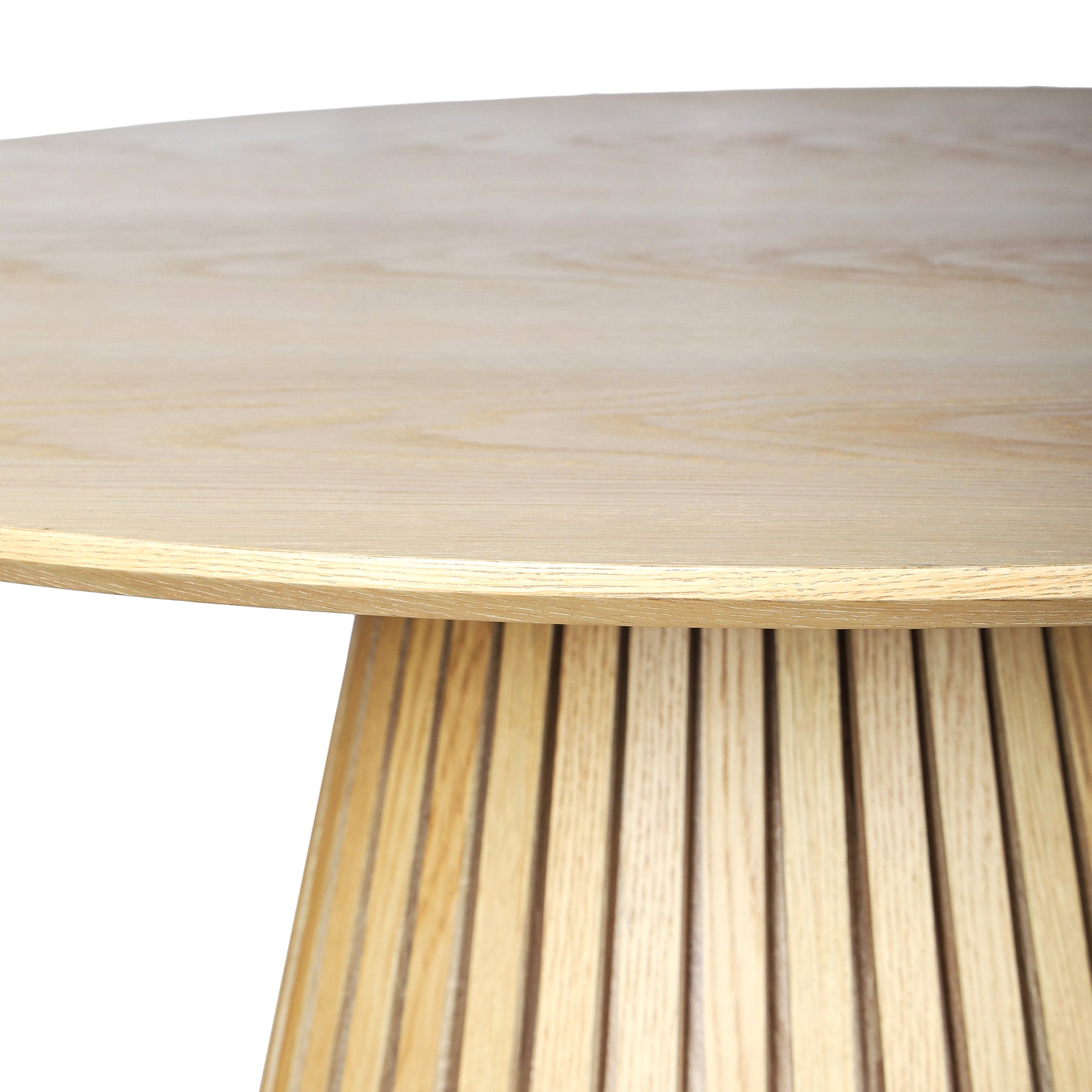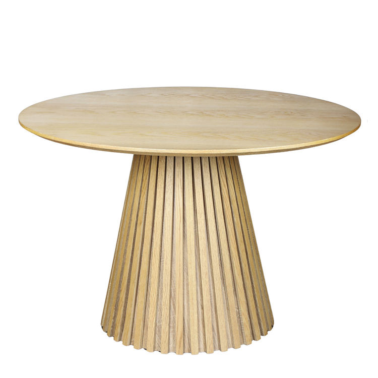La Mesa Breda parte de una forma conocida — la mesa redonda — y la interviene donde menos se espera: en la base. Sus listones verticales, trabajados uno a uno sobre la estructura cónica, aportan textura, profundidad y carácter.