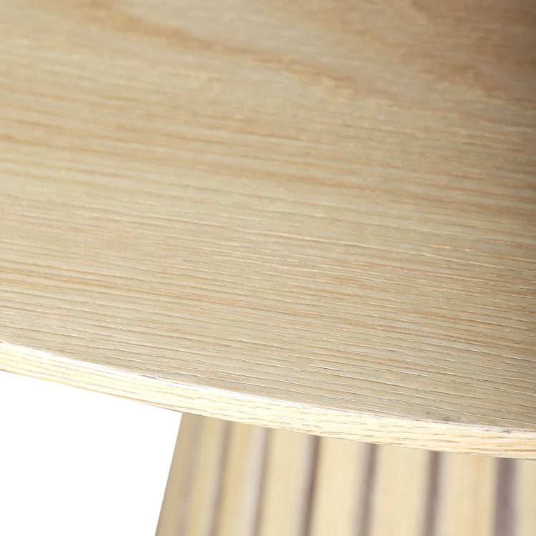 Enchapada en roble americano sobre tablero de alta presión, con la misma estabilidad y resistencia al uso cotidiano que caracteriza la línea. La tapa presenta una superficie lisa y cálida al tacto, mientras que la base estriada ofrece una experiencia táctil y visual completamente distinta: cada listón es una pieza trabajada de forma independiente, con el grano del roble siguiendo la verticalidad de la forma.