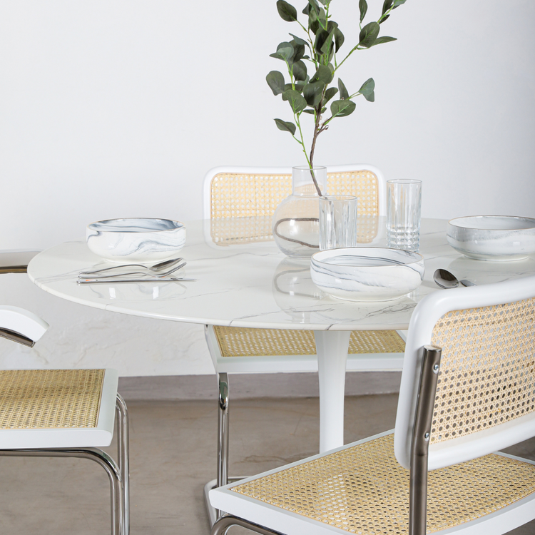 La mesa Tulip blanca es una obra maestra de diseño contemporáneo, creada con una tapa de vidrio templado y una base y pie metálicos para un aspecto moderno y resistente. Perfecta para aquellos que buscan estilo y funcionalidad en su hogar.
